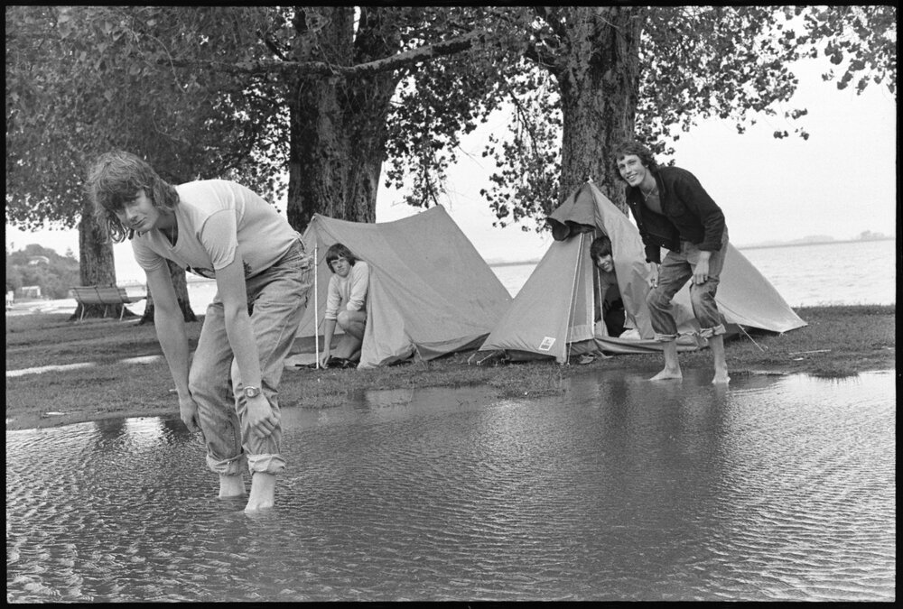 Date14 January 1976Reference Numberphoto gcc-38384DescriptionYoung school students from Wellington were inundated with rain in their tents at Tauranga motor camp. Pictured are Robert Catsbury, aged 17 (left) and Gill Mexted 16. Published 14 January 1976.FormatNegativePhysical Description35mm black-and-white negative (1/6)Photographer/CreatorBay of Plenty Times