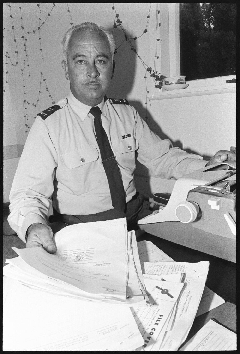 Date16 January 1976Reference Numberphoto gcc-38450DescriptionConstable Alex Farmer of the Mount Maunganui police at his desk prior to being transferred to Auckland Central. Published 16 January 1976.FormatNegativePhysical Description35mm black-and-white negative (1/4)Photographer/CreatorBay of Plenty Times