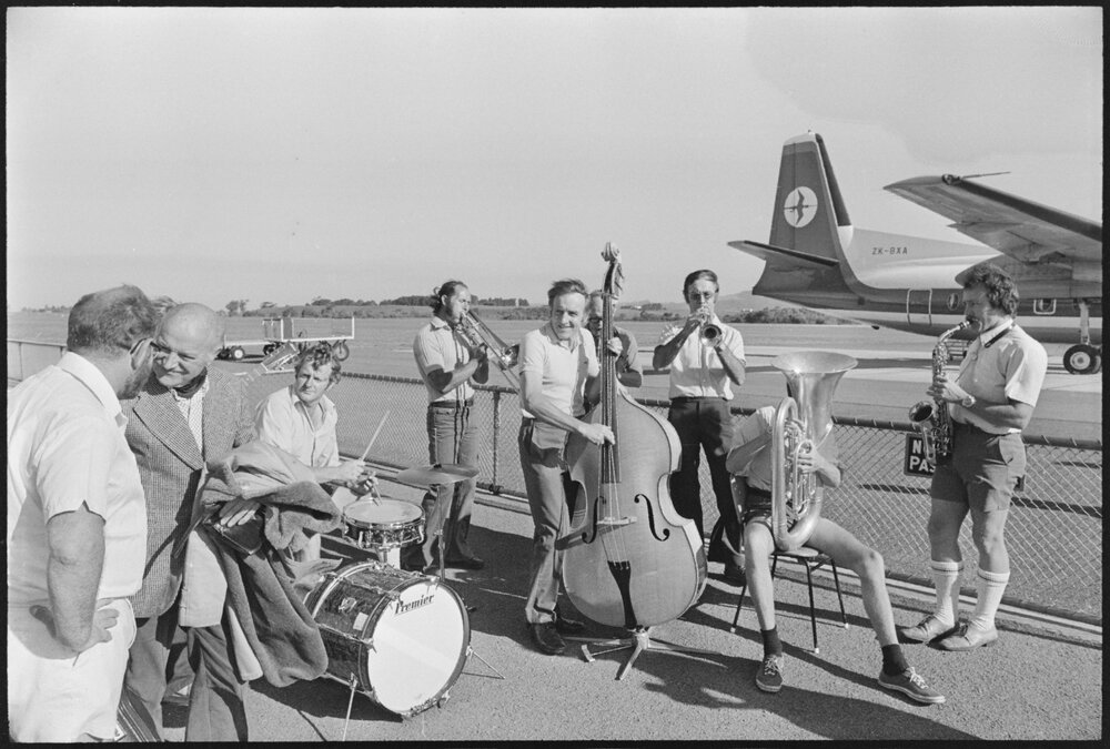 Date23 January 1976Reference Numberphoto gcc-38657DescriptionBud Freeman (left), American tenor saxophonist, arrived in Tauranga to the sound of jazz played by members of the National Jazz Festival who turned out to welcome him at Tauranga Airport. Published 23 January 1976.FormatNegativePhysical Description35mm black-and-white negative (5/12)Photographer/CreatorBay of Plenty Times