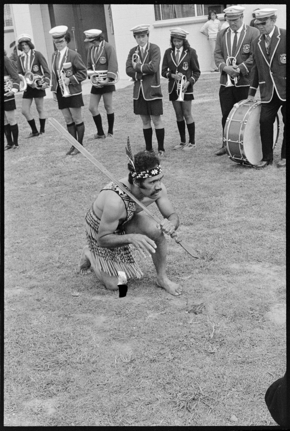 Date31 January 1976Reference Numberphoto gcc-38872DescriptionA gathering at the Waikari Marae, Matapihi to open the new dining hall was attended by Leader of the Opposition, Mr Rowling. Wero by Thomas Tata. Brass band in the background. Published 31 January 1976.FormatNegativePhysical Description35mm black-and-white negative (3/15)Photographer/CreatorBay of Plenty Times