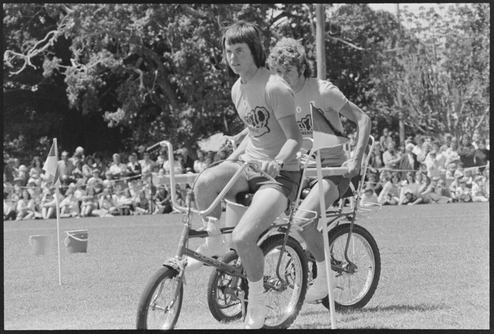 Date2 February 1976Reference Numberphoto gcc-38891DescriptionCompetitors balance a bucket of water as they cycle on their 'Choppers' at the Tauranga Top Town event at Tauranga Domain. Published 2 February 1976.FormatNegativePhysical Description35mm black-and-white negative (1/6)Photographer/CreatorBay of Plenty Times