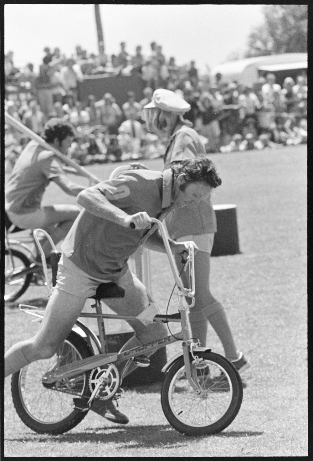 Date2 February 1976Reference Numberphoto gcc-38897DescriptionCompetitors balance a bucket of water as they cycle on their 'Choppers' at the Tauranga Top Town event at Tauranga Domain. Published 2 February 1976.FormatNegativePhysical Description35mm black-and-white negative (1/6)Photographer/CreatorBay of Plenty Times