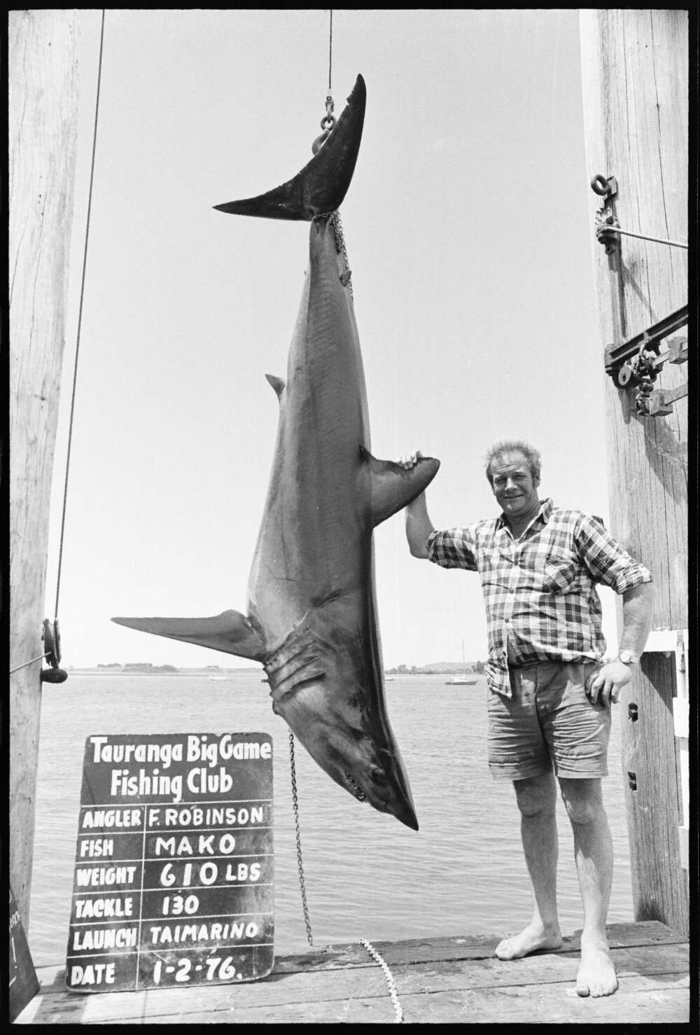 Date3 February 1976Reference Numberphoto gcc-38933DescriptionDrury angler, Fred Robinson, caught a 277kg mako shark off Tūhua (Mayor Island) after seven hours and 20 minutes. Steadying the fish is Merv Sowerby, skipper of the launch Taimarino, from which it was caught. Published 3 February 1976.FormatNegativePhysical Description35mm black-and-white negative (3/12)Photographer/CreatorBay of Plenty Times