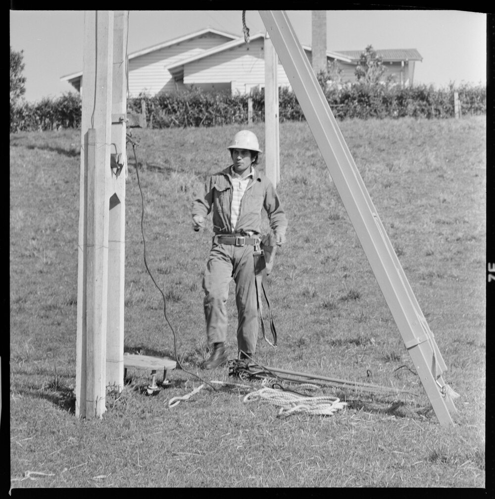 Date20 October 1972Reference NumberPhoto gca-21225DescriptionMen carrying out practical examinations on Cambridge Road to qualify for their certificates of competency as electrical linemen. Not published 20 October 1972.FormatNegativePhysical Description120-format cellulose triacetate black and white negative (1/6)Photographer/CreatorBay of Plenty Times