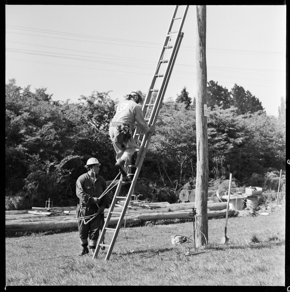 Date20 October 1972Reference NumberPhoto gca-21226DescriptionMen carrying out practical examinations on Cambridge Road to qualify for their certificates of competency as electrical linemen. Not published 20 October 1972.FormatNegativePhysical Description120-format cellulose triacetate black and white negative (2/6)Photographer/CreatorBay of Plenty Times