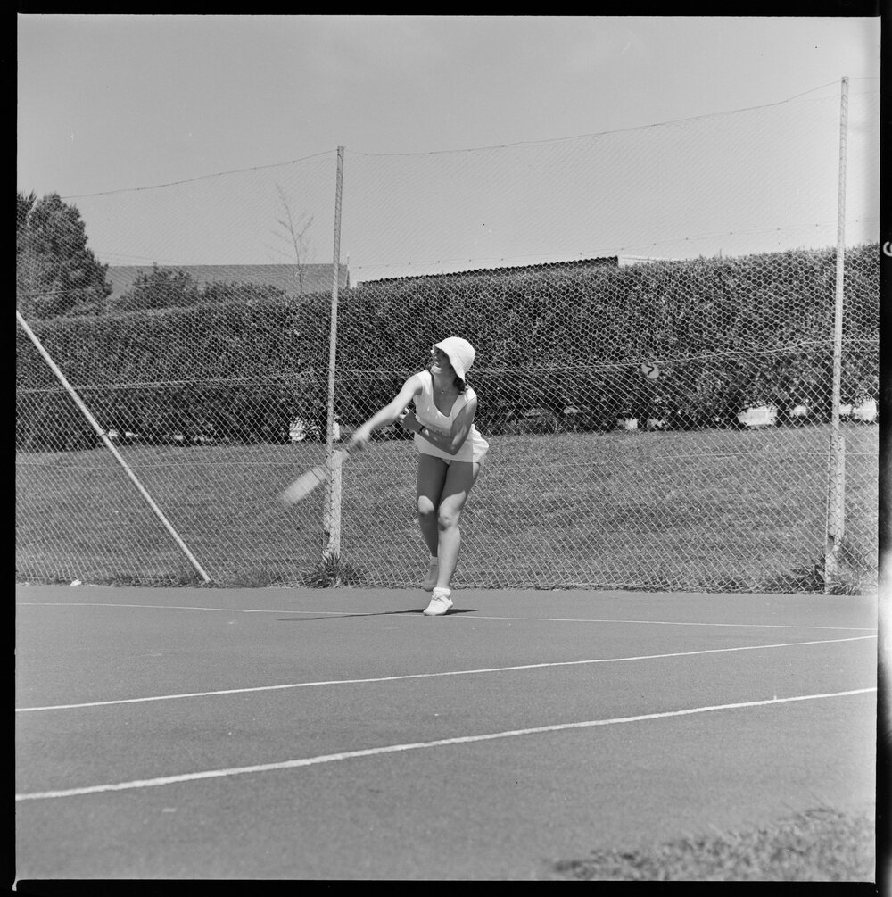 Date23 October 1972Reference NumberPhoto gca-21248DescriptionMrs Patricia Robertson of Ngaruawāhia serves in her singles match at Gate Pā junior tennis tournament. Published 23 October 1972.FormatNegativePhysical Description120-format cellulose triacetate black and white negative (1/2)Photographer/CreatorBay of Plenty Times