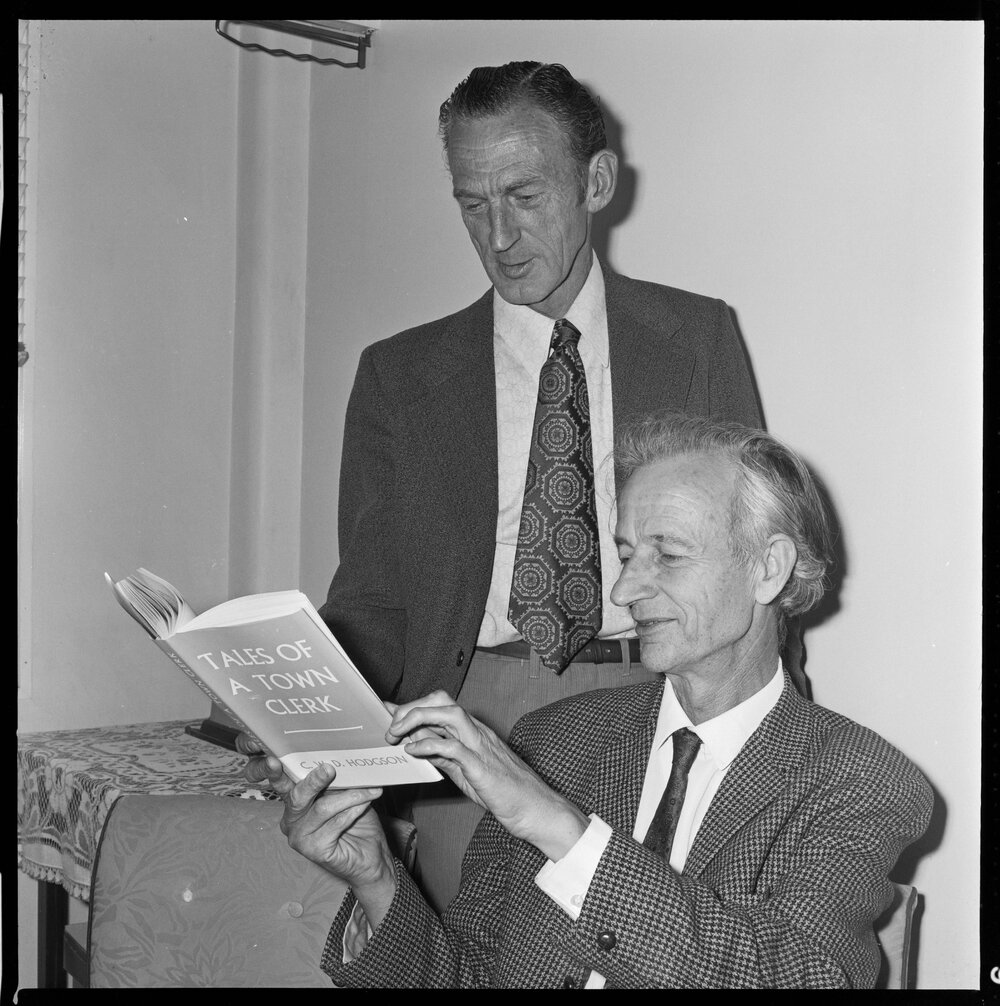 Date26 October 1972Reference NumberPhoto gca-21269DescriptionFormer RNZAF comrades in arms, Messrs D. B. Collins (standing) and C. W. D. Hodgson discussing the latter's forthcoming book, "Tales of a Town Clerk". Published 26 October 1972.FormatNegativePhysical Description120-format cellulose triacetate black and white negative (1/2)Photographer/CreatorBay of Plenty Times