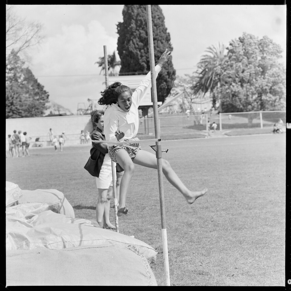 Date26 October 1972Reference NumberPhoto gca-21271DescriptionCarol Ririnui, aged 12, of Maungatapu Primary, takes the bar during an attempt at high jump during a sports day at Tauranga Domain where 20 local primary schools participated. Published 26 October 1972.FormatNegativePhysical Description120-format cellulose triacetate black and white negative (1/2)Photographer/CreatorBay of Plenty Times