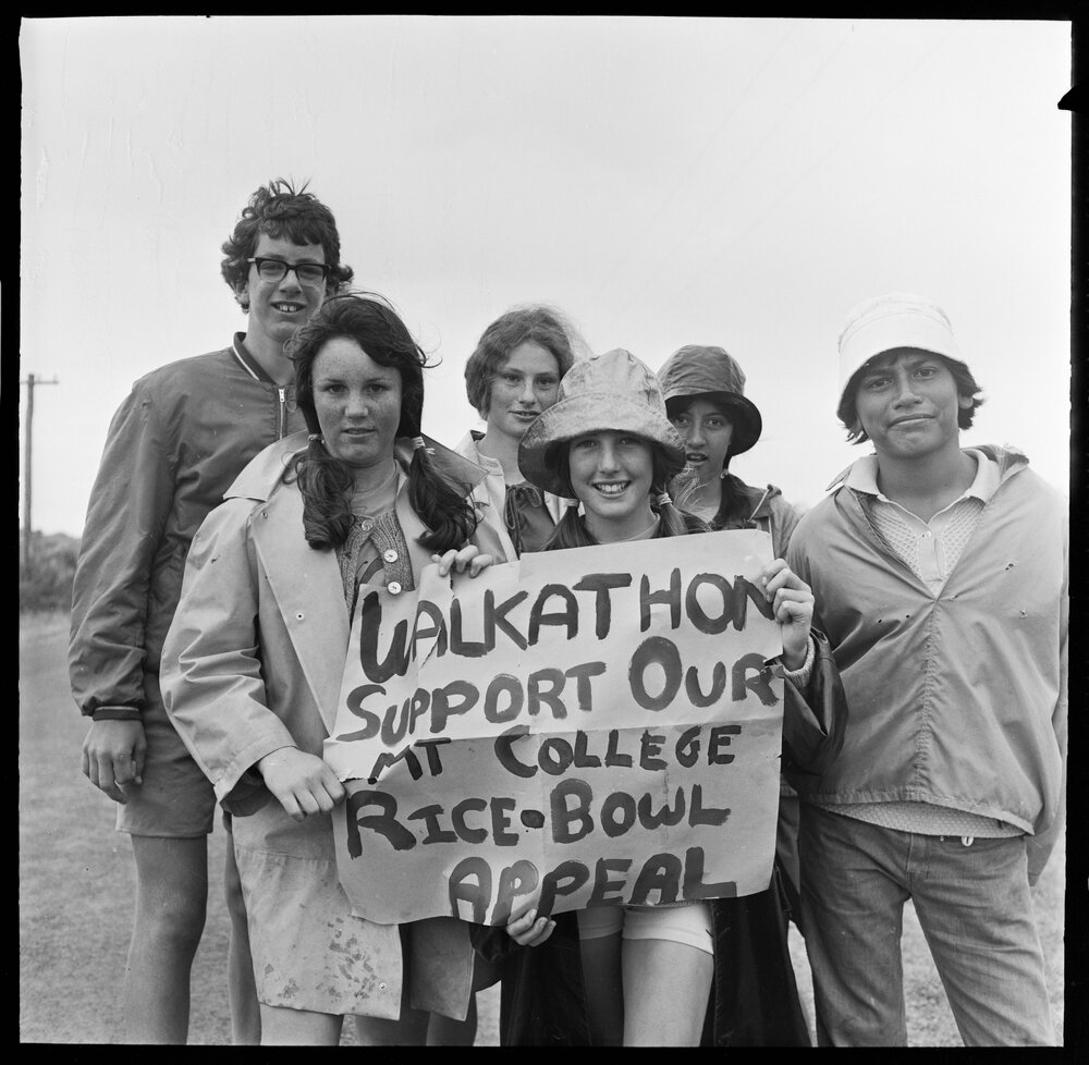 Date4 November 1972Reference NumberPhoto gca-21340DescriptionFrom left to right, Simon Flowers, Sharon Bradbury, Karen Golding, Pamela Anderson, Janet Scott and Teddy Hunt, members of the walkathon team. Published 4 November 1972.FormatNegativePhysical Description120-format cellulose triacetate black and white negative (1/2)Photographer/CreatorBay of Plenty Times