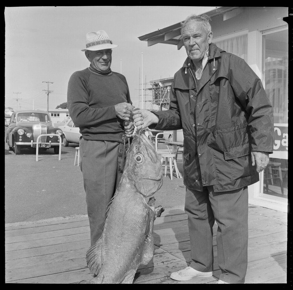 Date4 November 1972Reference NumberPhoto gca-21343DescriptionProud Tauranga anglers, John Stansbury (left) and Ken Watt show off their huge Hāpuka caught in 80 fathoms of water along with 25 smaller Hāpuka during a six-hour fishing trip this week. Published 4 November 1972.FormatNegativePhysical Description120-format cellulose triacetate black and white negative (2/2)Photographer/CreatorBay of Plenty Times