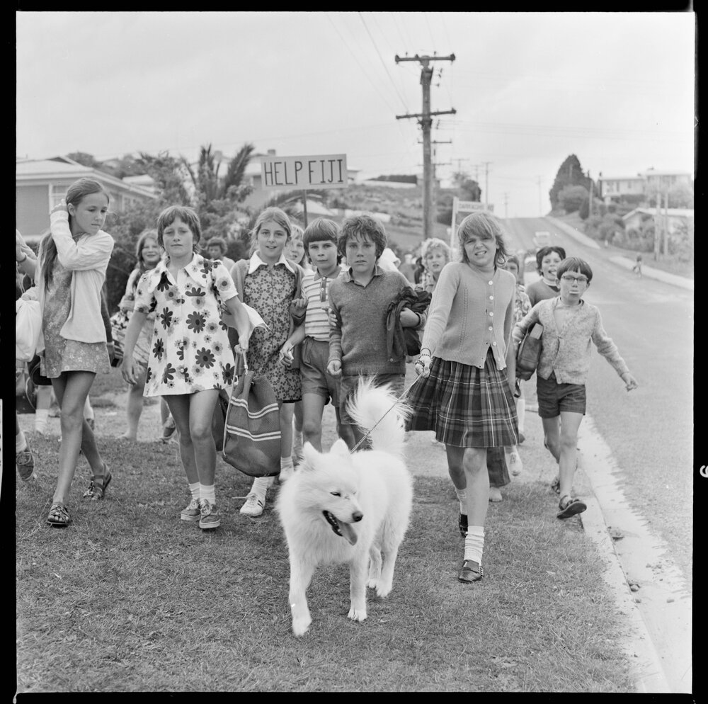 Date17 November 1972Reference NumberPhoto gca-21423DescriptionŌtūmoetai Primary School pupils on their walkathon down Ōtūmoetai Road, fundraising money the Mayor's Fiji life appeal. Published 17 November 1972.FormatNegativePhysical Description120-format cellulose triacetate black and white negative (1/2)Photographer/CreatorBay of Plenty Times