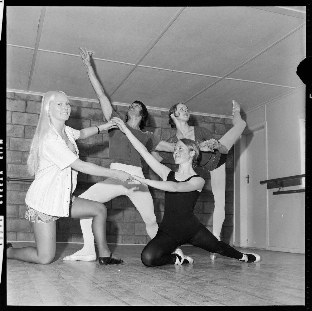 Date18 November 1972Reference NumberPhoto gca-21425DescriptionPractising at the academy with the new teacher Jill Woolford (left) is Leslie White, Jennifer Evans (rear) and Christine Wade. Published 18 November 1972.FormatNegativePhysical Description120-format cellulose triacetate black and white negative (1/2)Photographer/CreatorBay of Plenty Times