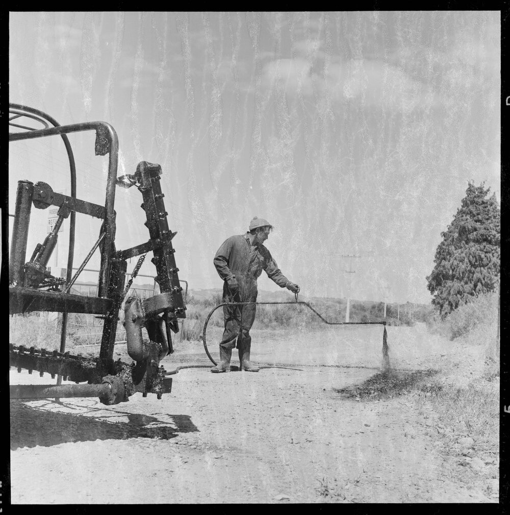 Date15 February 1973Reference NumberPhoto gca-21513DescriptionSealing of the road on Truman Lane after years of unhappy residents pitching for a solution to the major dust problem from their unsealed road at Te Maunga. Published 15 February 1973.FormatNegativePhysical Description120-format cellulose triacetate black and white negative (1/2)Photographer/CreatorBay of Plenty Times