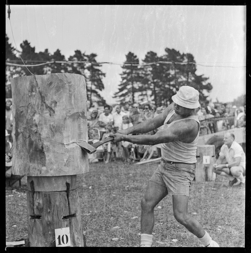 Date19 February 1973Reference NumberPhoto gca-21540DescriptionTūrangi axeman, Ruru Cook, sends chips flying as he competes in the butcher's chop at the Te Puke A and P Show on Saturday. Published 1973.FormatNegativePhysical Description120-format cellulose triacetate black and white negative (1/2)Photographer/CreatorBay of Plenty Times