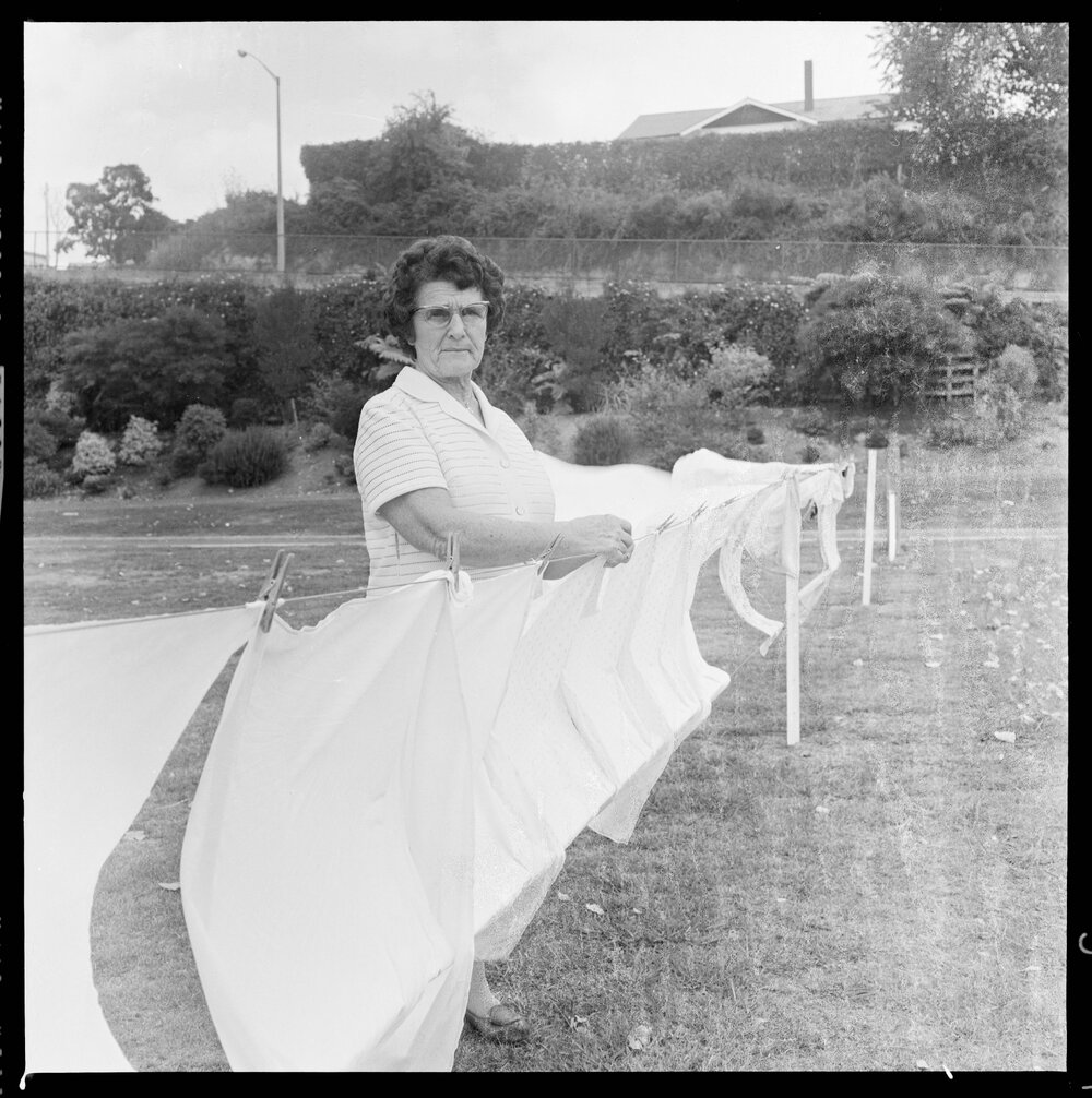 Date20 February 1973Reference NumberPhoto gca-21548DescriptionAustralian, Mrs M. Quill, on holiday from Sydney, gets on with the washing using a fence for a clothesline at the Sixth Avenue camping ground. Published 1973.FormatNegativePhysical Description120-format cellulose triacetate black and white negative (1/2)Photographer/CreatorBay of Plenty Times