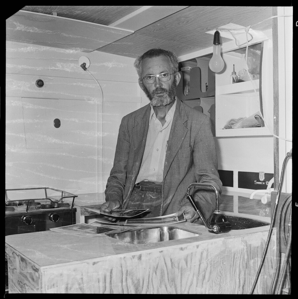 Date21 February 1973Reference NumberPhoto gca-21568DescriptionFrenchman Paul Fargo who planned to launch his 40ft trimaran at Tauranga in due course. He planned to take the yacht to the Pacific nuclear test zone. Published 21 February 1973.FormatNegativePhysical Description120-format cellulose triacetate black and white negative (1/1)Photographer/CreatorBay of Plenty Times