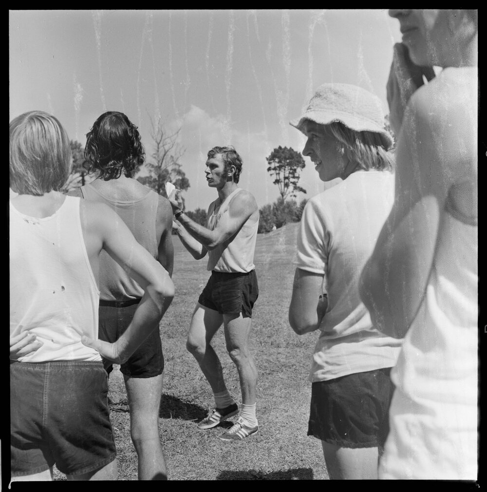 Date26 February 1973Reference NumberPhoto gca-21592DescriptionPeter Snell at the Tauranga Domain addressing some of the athletes, invited distance runners to accompany him on a training run after the clinic. Published 26 February 1973.FormatNegativePhysical Description120-format cellulose triacetate black and white negative (1/2)Photographer/CreatorBay of Plenty Times
