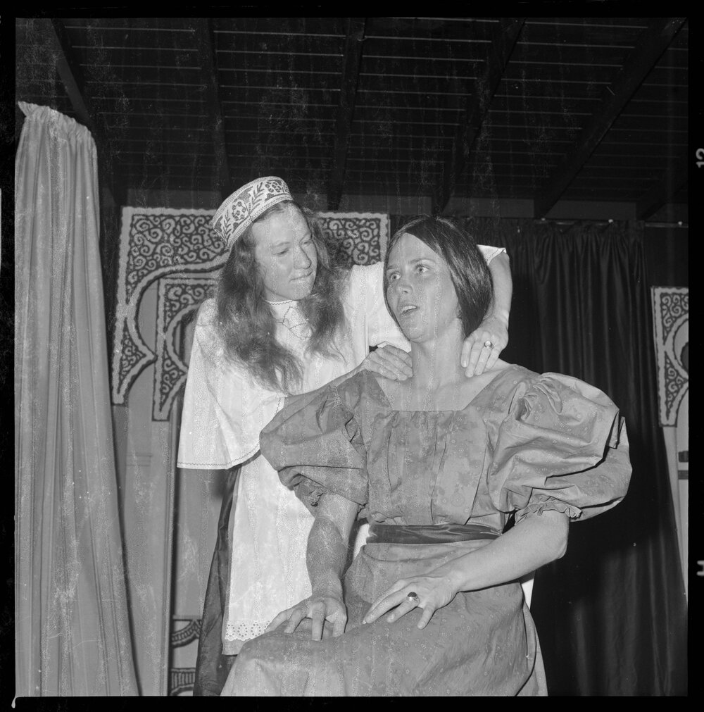 Date28 February 1973Reference NumberPhoto gca-21601DescriptionThe 10th production by Tauranga's Gateway Players opening night, "Arms vs The Man", with Jean Betts (back) who plays Louka and Jenny Ludlam, who is Raina. Published 28 February 1973.FormatNegativePhysical Description120-format cellulose triacetate black and white negative (1/2)Photographer/CreatorBay of Plenty Times