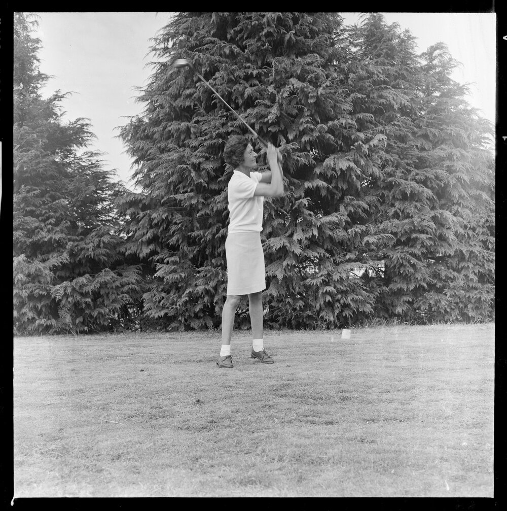 Date28 February 1973Reference NumberPhoto gca-21603DescriptionMrs S. Beamsley watches the flight of the ball after teeing-off during a round at the Tauranga Golf Club today. Published 28 February 1973.FormatNegativePhysical Description120-format cellulose triacetate black and white negative (1/2)Photographer/CreatorBay of Plenty Times