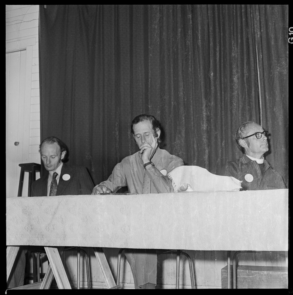 Date1 March 1973Reference NumberPhoto gca-21609DescriptionMr D. B. Wilson speaking to an audience at the drug symposium in Tauranga, expressing his opposition to legalising marijuana, seated next to him is vicar of St George's Anglican Church, Gate Pā, Archdeacon D. T. Ferguson. Published March 1973.FormatNegativePhysical Description120-format cellulose triacetate black and white negative (1/2)Photographer/CreatorBay of Plenty Times