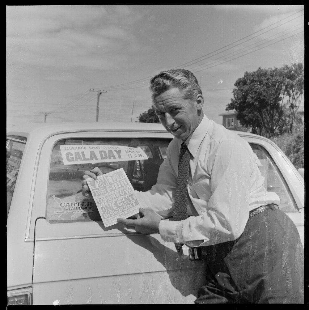 Date9 March 1973Reference NumberPhoto gca-21651DescriptionMr Gary Oster, president of Tauranga Girls College parent teacher association, showing invite to gala signs on the back of a car. Published 9 March 1973.FormatNegativePhysical Description120-format cellulose triacetate black and white negative (1/2)Photographer/CreatorBay of Plenty Times