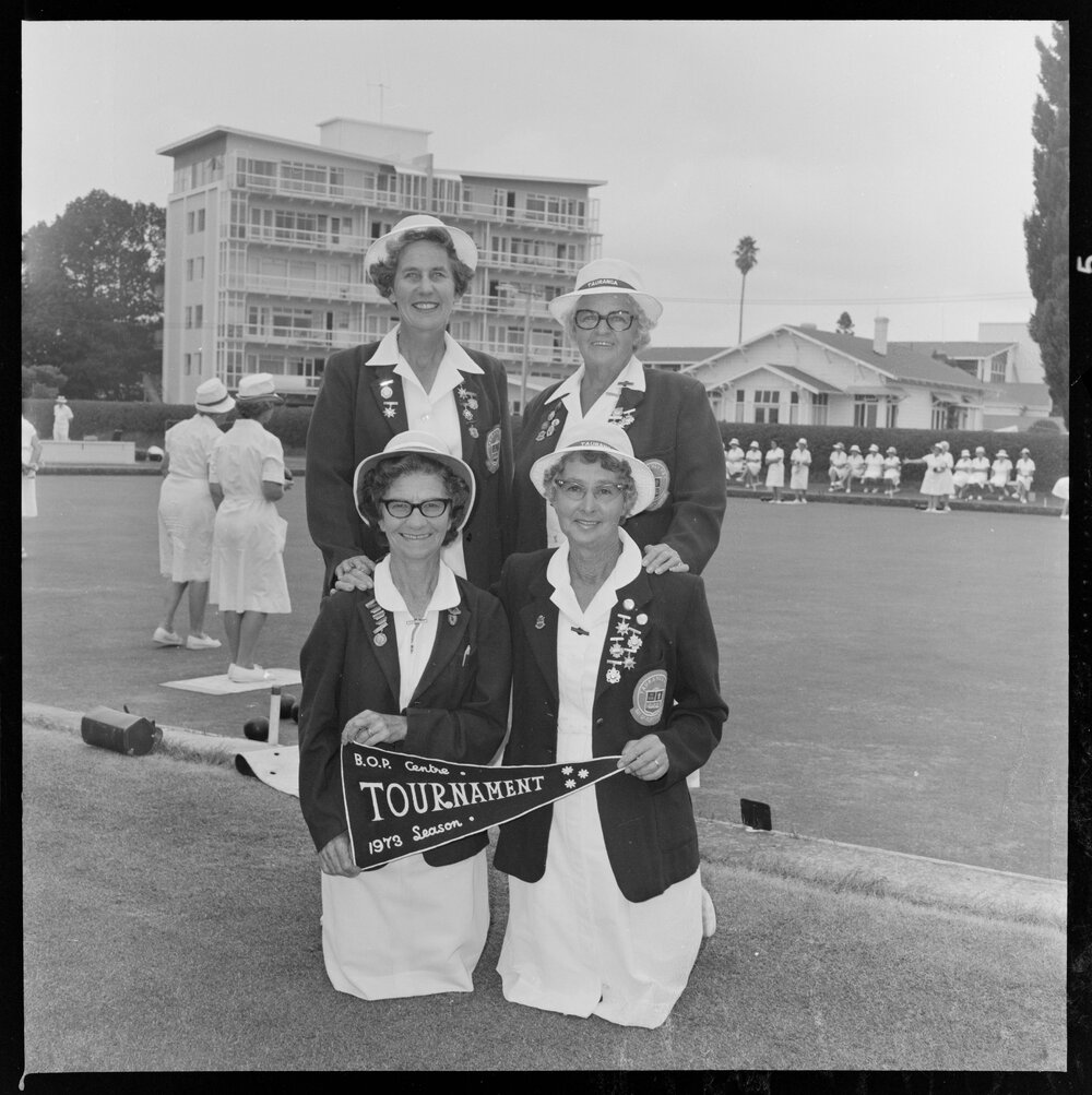 Date13 March 1973Reference NumberPhoto gca-21673DescriptionWinners of the Bay of Plenty Open Centre fours title are (rear) Messdames Leila Kirk, (left) Sis Fagan, in front, Eileen Hodder, and May Burgess. Published 13 March 1973.FormatNegativePhysical Description120-format cellulose triacetate black and white negative (1/2)Photographer/CreatorBay of Plenty Times