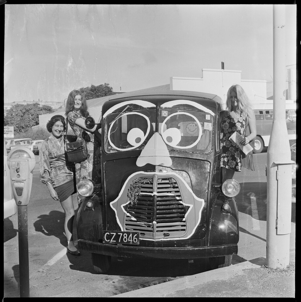 Date14 March 1973Reference NumberPhoto gca-21675DescriptionVan, owned by Marilyn Monro of Tauranga, pictured left is Mrs D. Munro and daughter Dianne, to the right is Julie Western. Published 14 March 1973.FormatNegativePhysical Description120-format cellulose triacetate black and white negative (1/2)Photographer/CreatorBay of Plenty Times