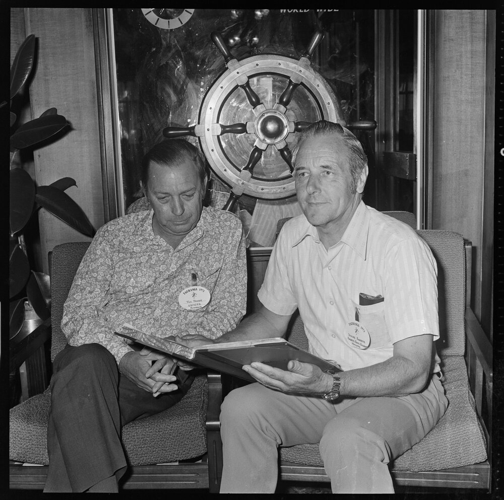Date19 March 1973Reference NumberPhoto gca-21693DescriptionMessrs J. Parker, president of the Graphic Arts, Platemaking and Employment Federation of Australia (left) and D. E. Roberts, president of the NZ Photo Process Federation, at the Tauranga hotel where the NZ Group's annual conference is being held. Published 19 March 1973.FormatNegativePhysical Description120-format cellulose triacetate black and white negative (1/2)Photographer/CreatorBay of Plenty Times