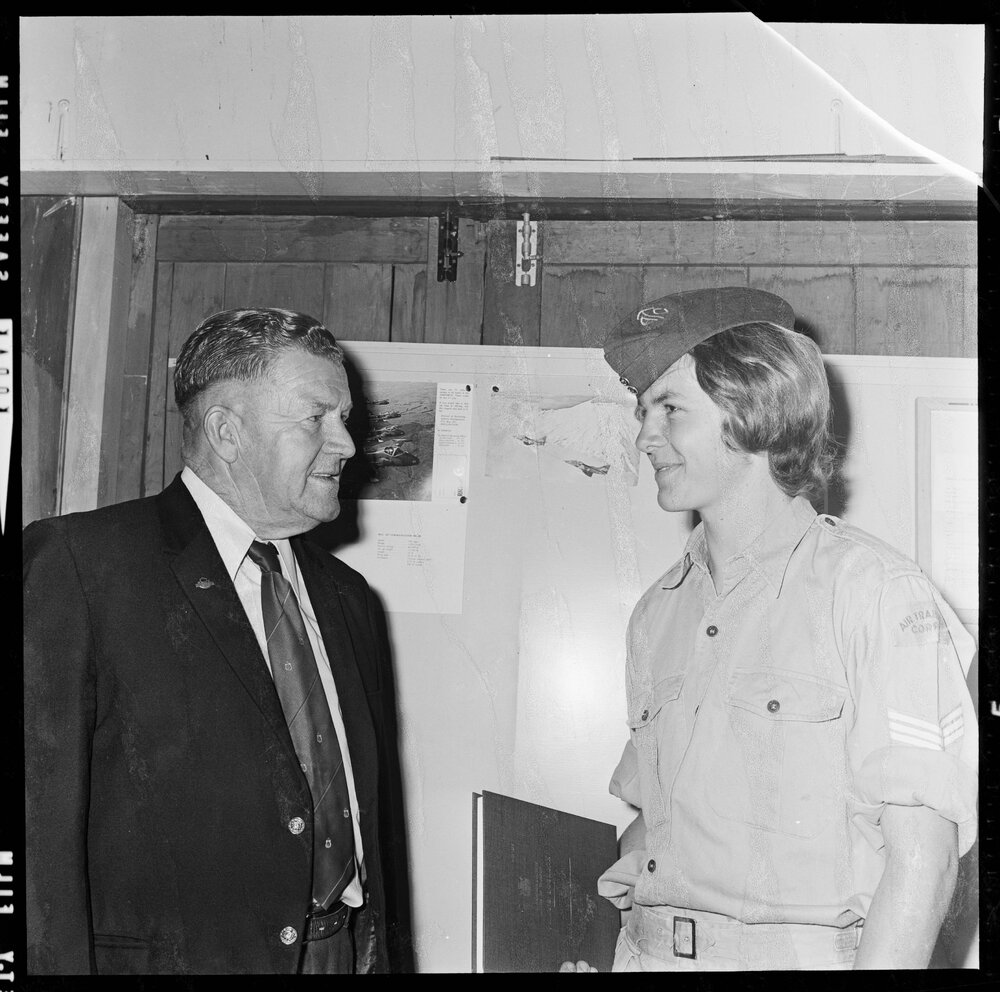 Date21 March 1973Reference NumberPhoto gca-21705DescriptionMr Lawrie hands Flight Seargeant John Watts his new logbook where he was also awarded with a $100 flight scholarship. Published 21 March 1973.FormatNegativePhysical Description120-format cellulose triacetate black and white negative (1/2)Photographer/CreatorBay of Plenty Times