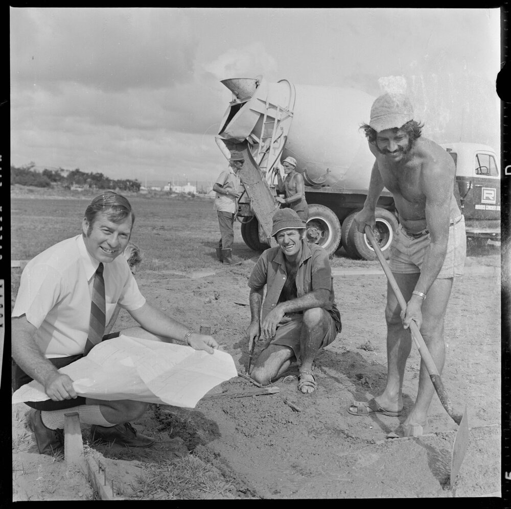 Date22 March 1973Reference NumberPhoto gca-21713DescriptionThe crew organising the first pour of concrete on the foundation for the Mount Maunganui club's new squash court at Blake Park. Published 22 March 1973.FormatNegativePhysical Description120-format cellulose triacetate black and white negative (1/2)Photographer/CreatorBay of Plenty Times