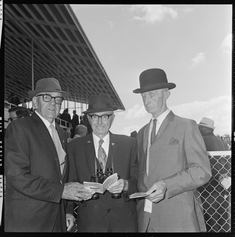 Date27 March 1973Reference NumberPhoto gca-21739DescriptionBay of Plenty Racing Club punters from left, Messrs F. Spreadborough, J. H. Evans, and Roy Wallis are life members of the racing club. Published 27 March 1973.FormatNegativePhysical Description120-format cellulose triacetate black and white negative (1/2)Photographer/CreatorBay of Plenty Times