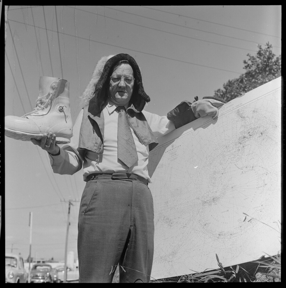 Date2 April 1973Reference NumberPhoto gca-21766DescriptionPublic relations officer, Mr Hal Williams, showing the appropriate gear he wore during his months in Antarctica on his recent visit to Tauranga. Published 2 April 1973.FormatNegativePhysical Description120-format cellulose triacetate black and white negative (1/2)Photographer/CreatorBay of Plenty Times