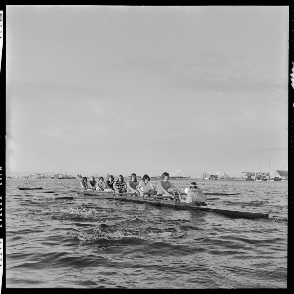 Date2 April 1973Reference NumberPhoto gca-21768DescriptionŌtūmoetai College rower eight who made the finals of the New Zealand Secondary rowing nationals at Lake Karāpiro. From left, N. Elvin, C. O'Brien, W. Blomquist, K, Mc Inloch, J. Waddington, I. O'Brien, A. van der Dungen, P. Rowbotham and D. Lepper. Published 2 April 1973.FormatNegativePhysical Description120-format cellulose triacetate black and white negative (1/2)Photographer/CreatorBay of Plenty Times