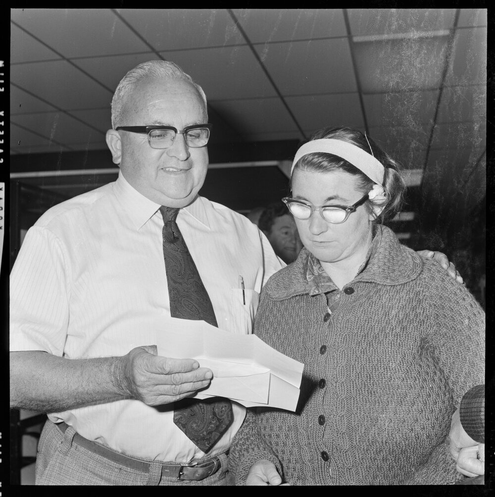 Date4 April 1973Reference NumberPhoto gca-21781DescriptionMrs Brown a deaf and partially blind member of the IHC workshop receiving a $5 voucher to purchase books of her own from Mr C. G. Purton, the manager of Thriftways Limited. Published 4 April 1973.FormatNegativePhysical Description120-format cellulose triacetate black and white negative (1/2)Photographer/CreatorBay of Plenty Times