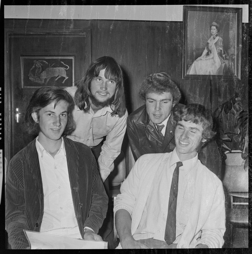 Date5 April 1973Reference NumberPhoto gca-21785DescriptionFour recipients who received graduation certificates at the farm cadet scheme presentation were from left to right, David Thomas, George Patello, Les Barry and Kevin Clarke. Published 5 April 1973.FormatNegativePhysical Description120-format cellulose triacetate black and white negative (1/2)Photographer/CreatorBay of Plenty Times