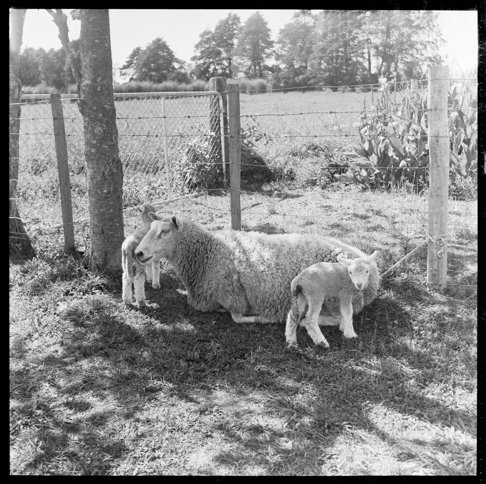 Date10 April 1973Reference NumberPhoto gca-21793DescriptionThe Border Leicester ewe belonging to Mr P. C. Allan of Bell's Road, Pāpāmoa has just given birth to a pair of twins, the same ewe also gave birth to a only seven months prior, a rarity for ewes. Published 10 April 1973.FormatNegativePhysical Description120-format cellulose triacetate black and white negative (1/2)Photographer/CreatorBay of Plenty Times