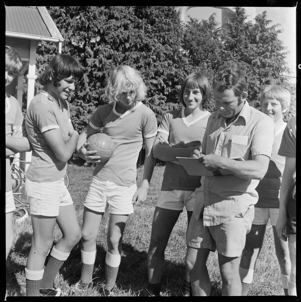 Date17 April 1973Reference NumberPhoto gca-21797DescriptionAllan Crawford, Phillip Merriman and Graeme Webb with the new Katikati soccer coach Mr Hugh Pearce at a briefing before the first game. Published 17 April 1973.FormatNegativePhysical Description120-format cellulose triacetate black and white negative (1/2)Photographer/CreatorBay of Plenty Times