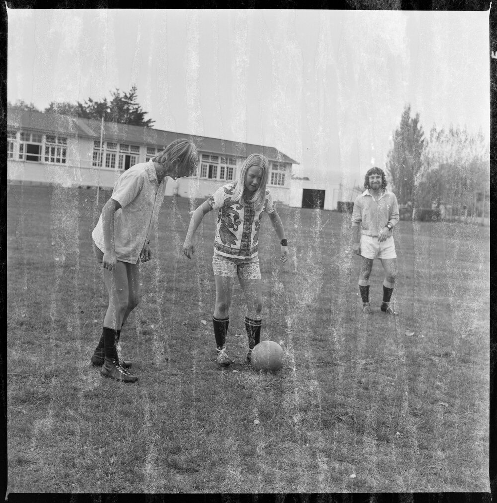 Date21 April 1973Reference NumberPhoto gca-21811DescriptionSoccer training for Katikati girls team members Deborah Wilson (left) and Gaylene Bidois, with coach, Peter Troy watching nearby. Published 21 April 1973.FormatNegativePhysical Description120-format cellulose triacetate black and white negative (1/2)Photographer/CreatorBay of Plenty Times
