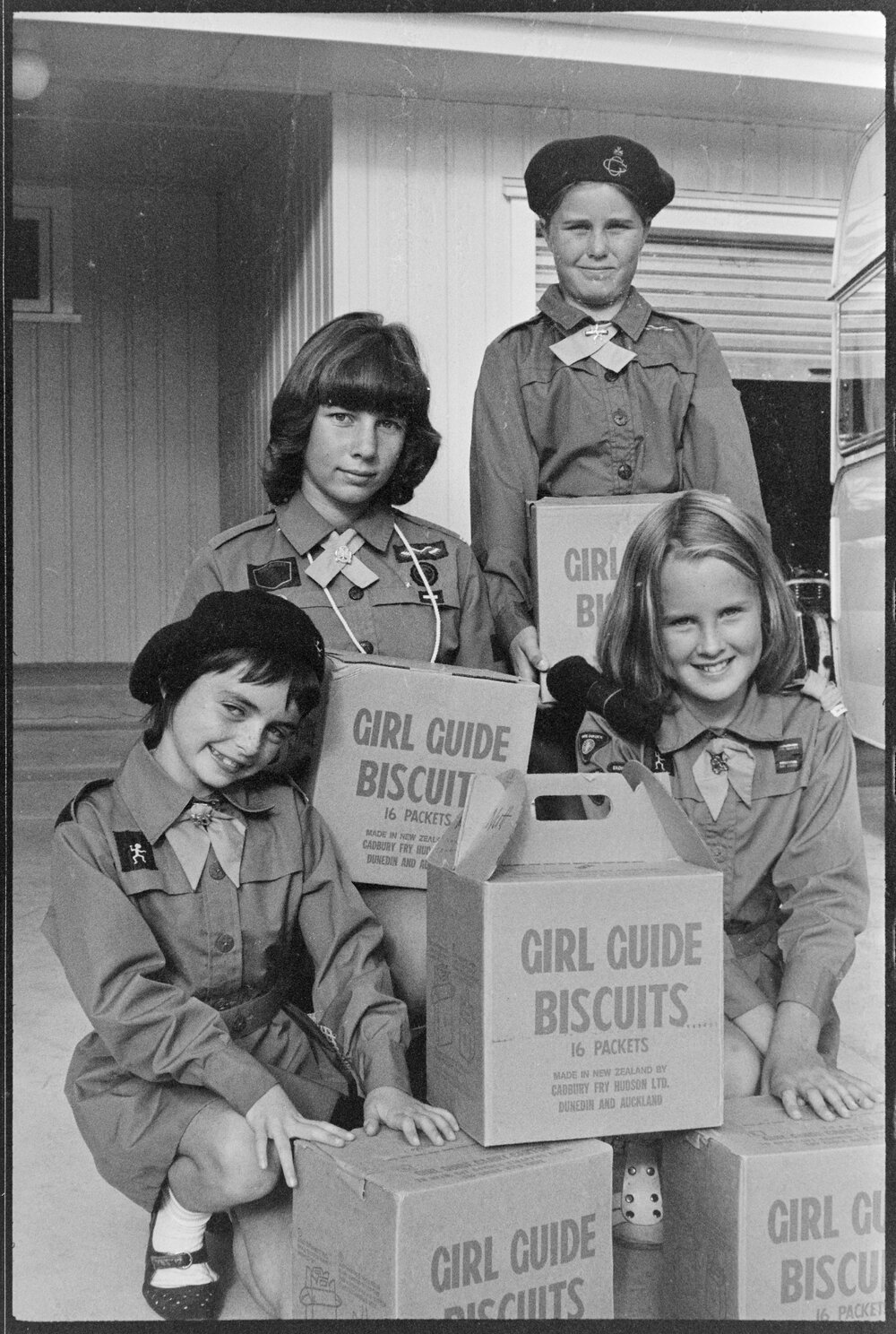 Tauranga Guides and Brownies ready to fundraise by selling Girl Guide biscuits. Erin, Lynda, Jennifer and Janiene. Published Bay of Plenty Times, 6 April 1973. Te Ao Mārama - Tauranga City Libraries Photo gcc-27398