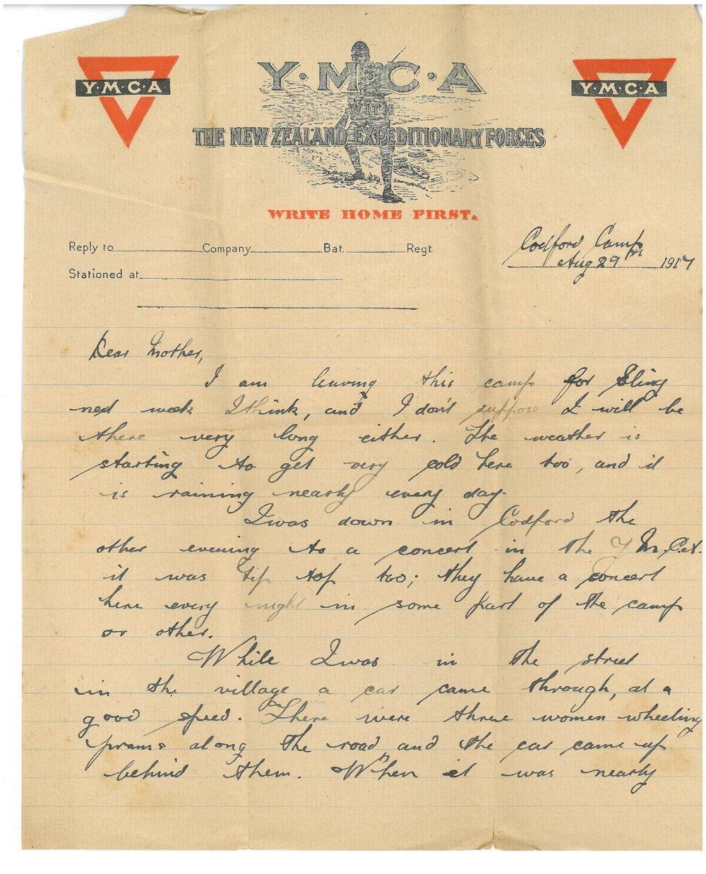 Letter written by Leonard Garfield Goodacre (1893-1977) to his mother Mary Goodacre on 29 August 1917 while serving in the New Zealand Medical Corp during the First World War. Te Ao Mārama - Tauranga City Libraries Ams 469/3/6
