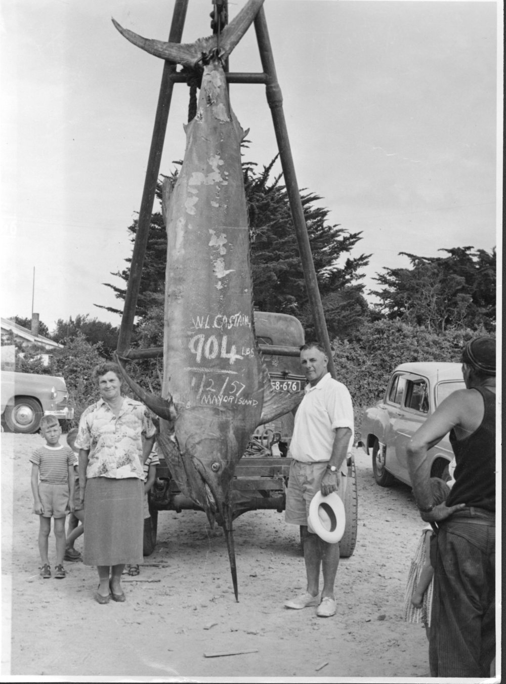 W.L. Castaing with marlin caught at Tūhua (Mayor Island), February 1957.