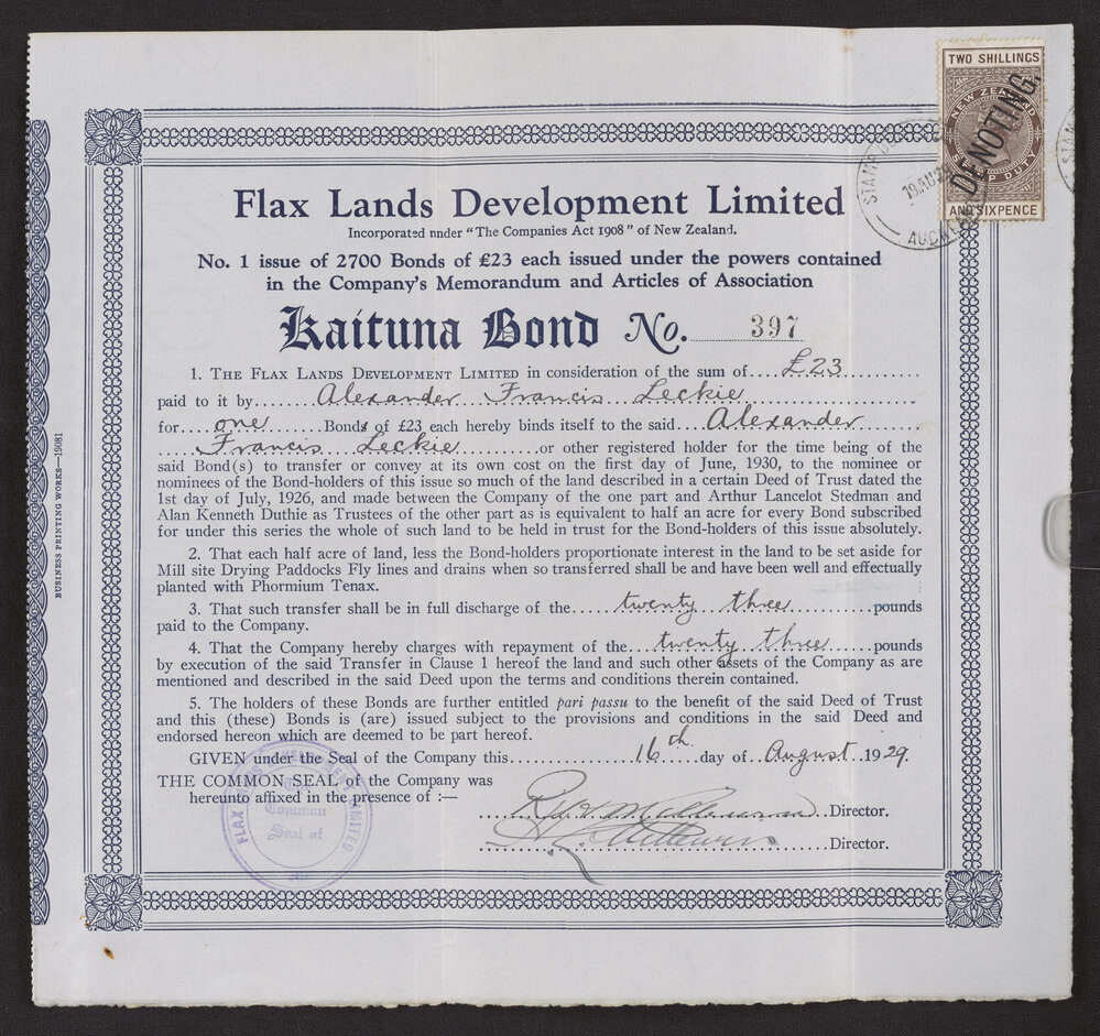 Kaituna Bond No. 397 issued to Alexander Francis Leckie, August 1929 by Flax Lands Development Ltd.