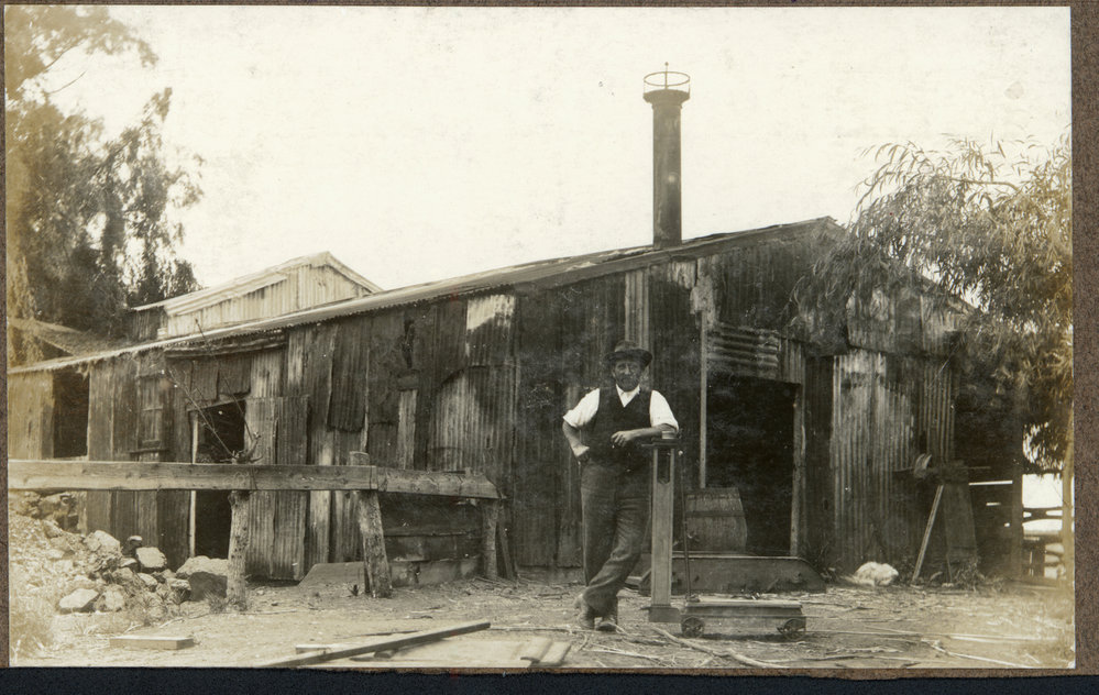 Jim Paterson standing in front of Paroa flax mill, 1912.