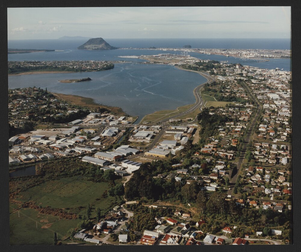 Date1999Reference NumberMap 24-406DescriptionColour aerial photograph of Tauranga looking north to Mauao and the Waikareao Estuary from near the Historic Village in Seventeenth Avenue.Map TypeAerial ImageryPhysical DescriptionRolled - colour map size is 43cm x 51cm