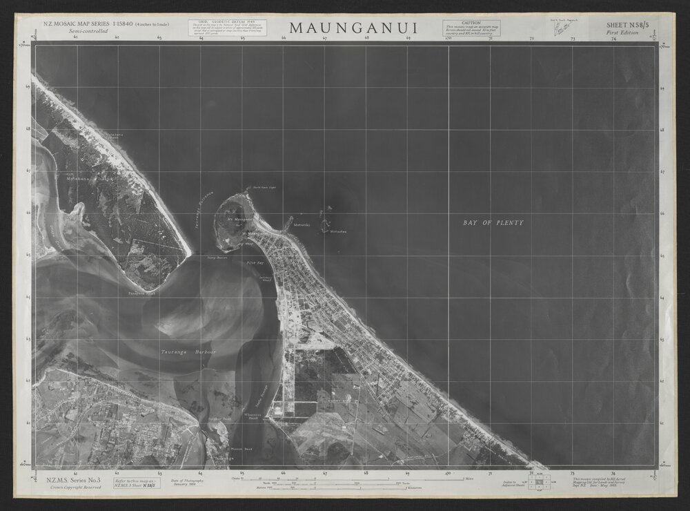 DateJanuary 1959Reference NumberMap 22-003DescriptionAerial photograph of Mount Maunganui, Salisbury Wharf, Matakana Island, Te Awanui Tauranga Harbour.Barcode33001000265040CreatorNZ Aerial Mapping LtdMap TypeAerial ImageryPhysical DescriptionBlack and white, map size is 67cm x 92cmScale1:15840 (4 inches to a mile)