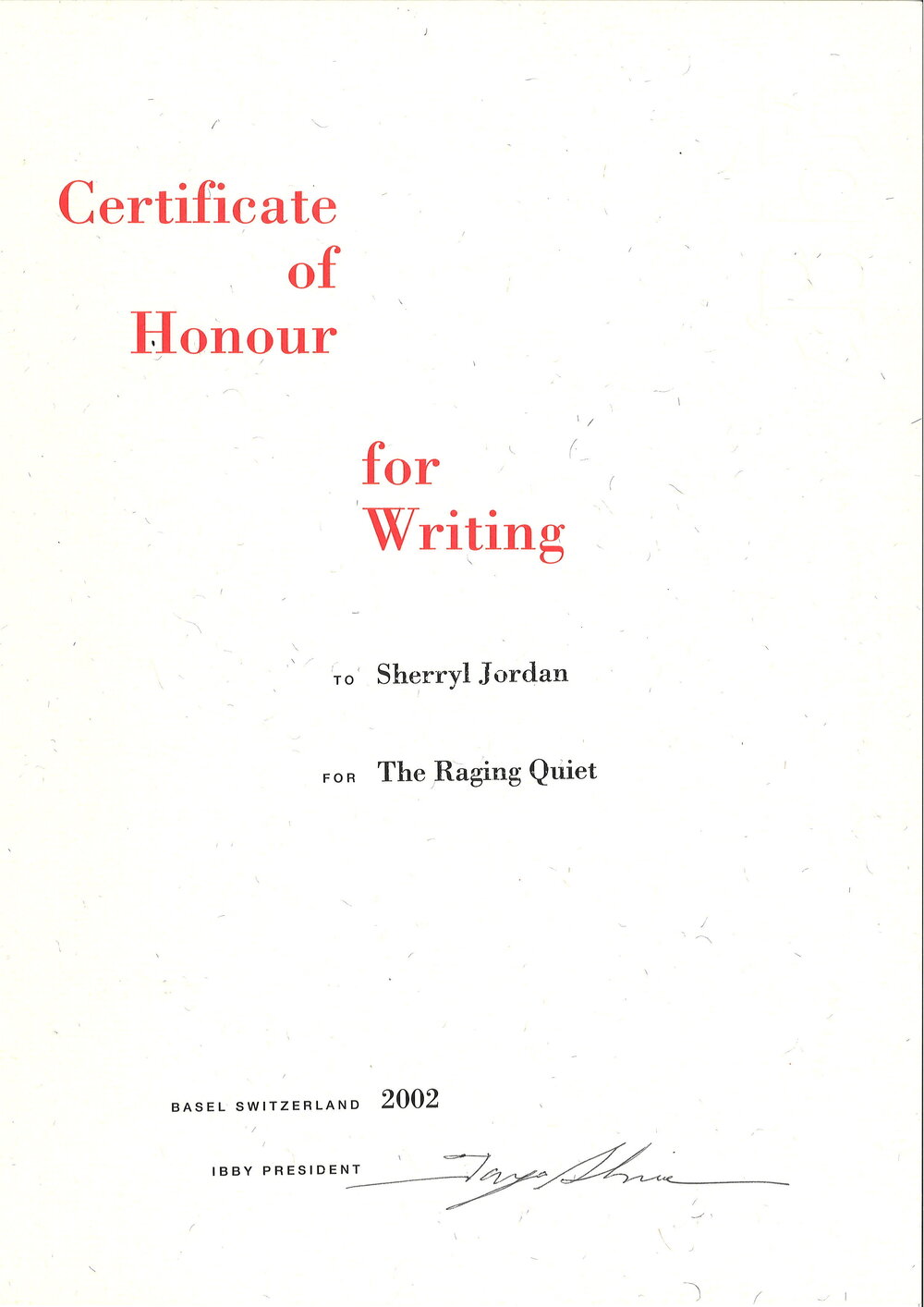 International Board on Books for Young People, Certificate for The Raging Quiet, 2002 (2002). Pae Korokī, accessed 04/04/2026, https://paekoroki.tauranga.govt.nz/nodes/view/118480