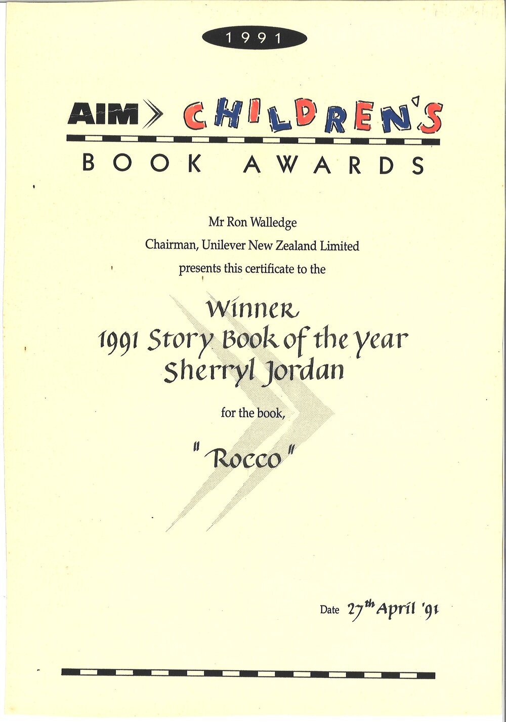 AIM Children's Book Awards, Certificate for Rocco, Apr 1991 (27 April 1991). Pae Korokī, accessed 04/04/2026, https://paekoroki.tauranga.govt.nz/nodes/view/118485