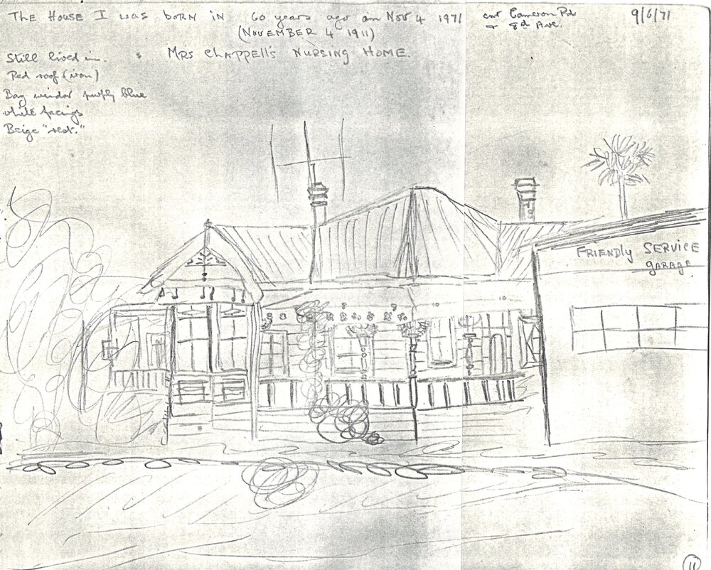 Date1971Reference NumberPhoto 25-1923DescriptionPhotocopied pencil sketch (across two pieces of paper) showing the The Palms, Maternity Nursing Home on Cameron Road between 8th and 9th AvenuesFormatDigitalPhotographer/CreatorSmith, Thelma Constance (née Smedley), 1911-2006