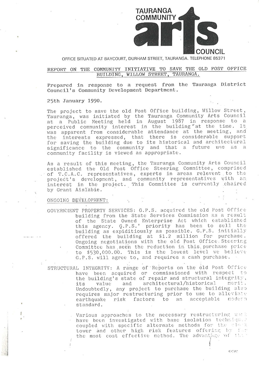 Tauranga Community Arts Council, Report on the community initiative to save the old Post Office building, Willow Street, Tauranga (25 January 1990). Pae Korokī, accessed 05/04/2026, https://paekoroki.tauranga.govt.nz/nodes/view/118612