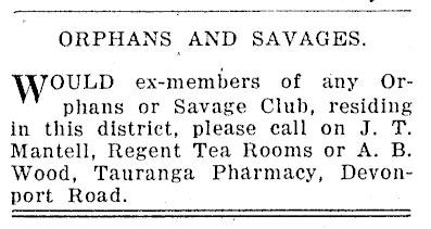 1921 Jan: Meeting convened for those interested in forming a local Savage Club at Mr Meadow's rooms, Security Buildings, deciding to 'form an Orphans Club'.